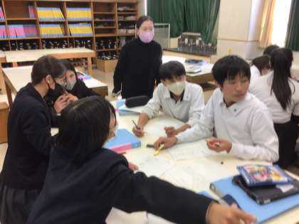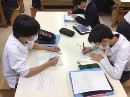 2年生美術の授業の様子です。CM作りに取り組み、ワークシートを使って、構成を考えているところです。
