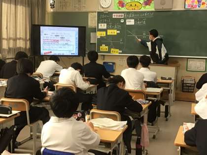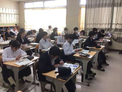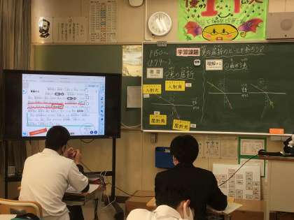 1年生の理科の授業の様子です。光の屈折についてのまとめです。空気中からガラスや水の中に進んだ場合、どちらに光が曲がって進むのかを学びました。テストにもよく出る内容です。
