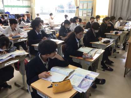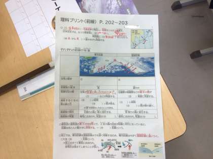 2年生の授業の様子です。天気の前線についての授業です。デジタル教科書や自作のワークシートを使って、学習を進めています。