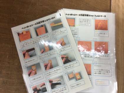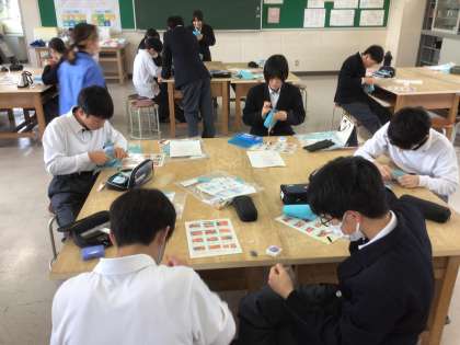 1年生の家庭科の授業の様子です。ペットボトルケースの作成に取り組んでいます。作成を進めやすいように写真付きの自作の手順書を見ながら活動しています。みんなオリジナルの作品作りに意欲的に取り組んでいます。