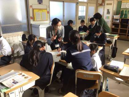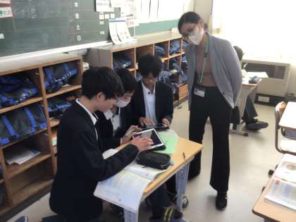 1年生英語の授業の様子です。今日はALTの先生と会話しながら、自分の好きな人物について、英語でコミュニケーションをとりました。