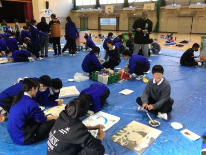 前回考えた、アートダストボックスのデザインを実際にダストボックスにデザインに取り組みました。アーティストさと一緒に一生懸命活動しています。