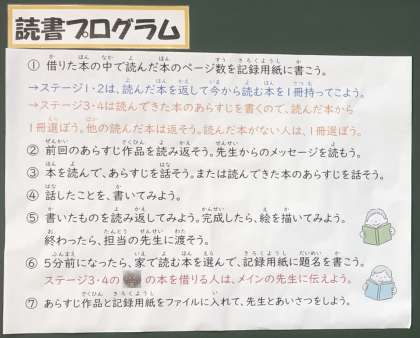 外国にルーツのある生徒の読書プログラムの様子です。日本語レベルに合わせて本を選択し、音読または黙読し、登場人物や大まかなあらすじを教師に伝えます。その後、そのあらすじを文字に書き表します。継続することで、日本語の力がずいぶんと上達してきているのを感じます。