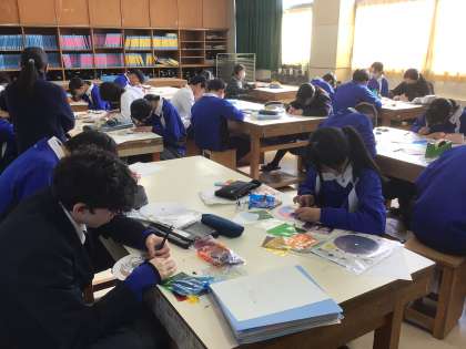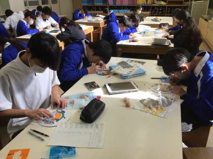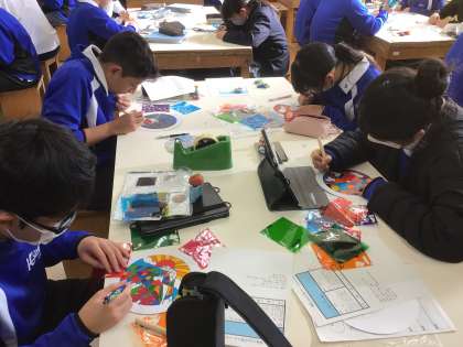 3年生の美術時間の様子です。ステンドグラス風の壁時計の制作に取り組んでいます。セロファンを使って、自分の考えたデザインで、とても綺麗な作品が出来そうです。