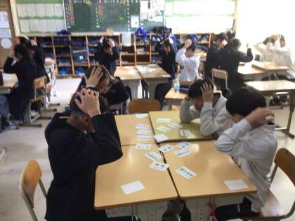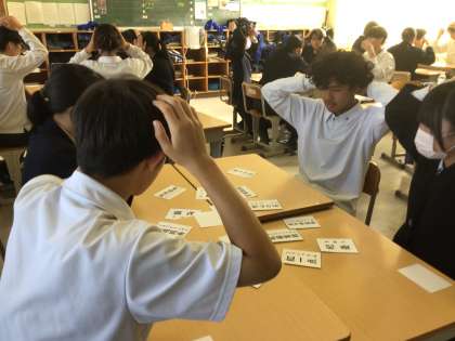 2年生の授業の様子です。故事成語カルタを行いました。2年生になると語彙も増えて、かなり素早く、大変盛り上がっているいました。