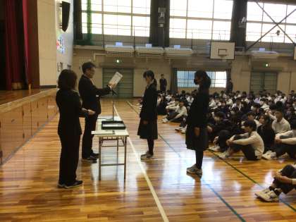 全校集会の様子です。はじめに表彰を行いました。