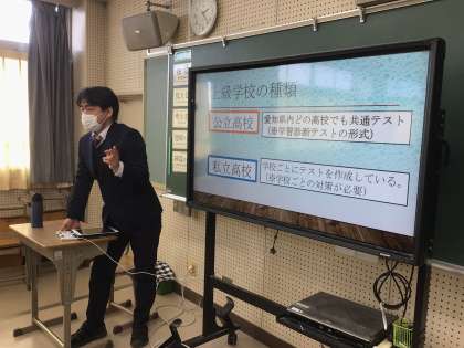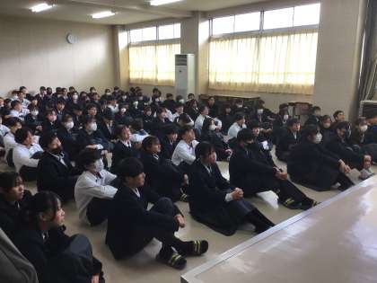 1年生の進路学習会の様子です。1年生の時から、2年後を見据えて、受験の仕組みなどについて学習しています。みんな真剣に聞いています。