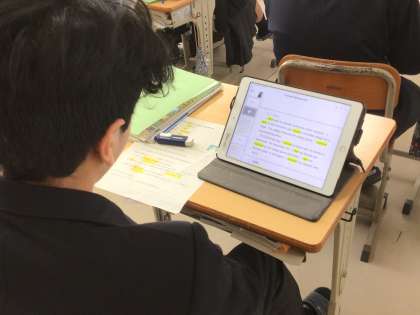 1年生の英語の授業の様子です。過去形について学びました。タブレットも活用して、勉強をしています。