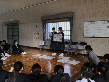 2年生が衣台高校との交流会で発表する内容について、1年生に発表を聞いてもらいました。