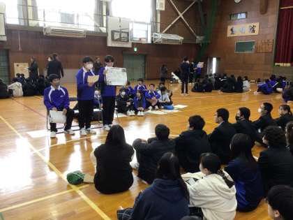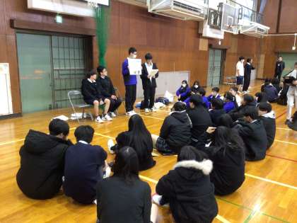 1/22(木)に衣台高校に行き、高校1年生の生徒との交流会を行いました。準備してきた発表を立派に行うことができました。その後、高校生が調べた「各国のスポーツ体験」をに参加し、フットバレーやモルック、アルティメットなどのスポーツで交流しました。