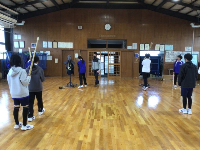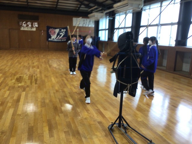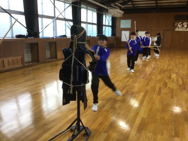 剣道で竹刀を使って、打ち込み台に向かって、打ち込んでいます。