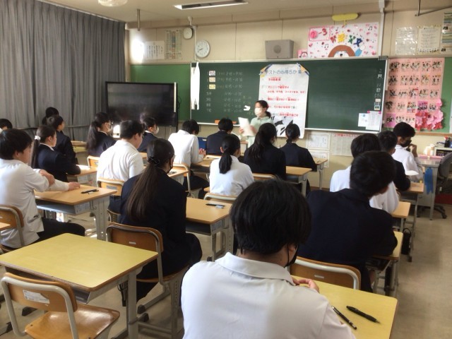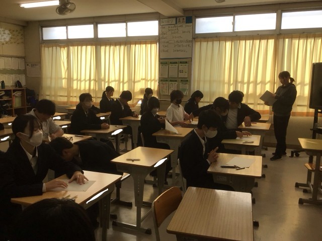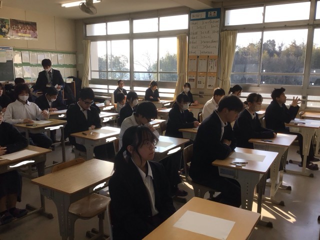 2年生の定期テスト2日目の様子。開始直前で、緊張感があります。