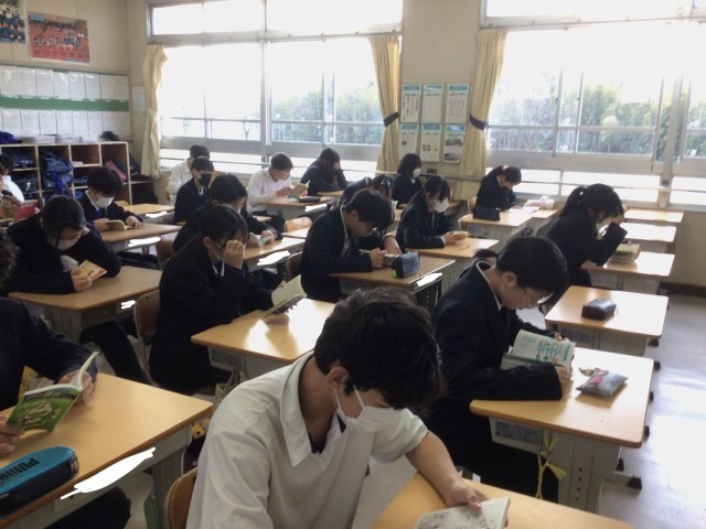 朝の読書タイムの様子です。保見中学校では、毎日朝の10分間は、全学年読書タイムになっています。とても静かで、落ち着いた雰囲気で読書をしています。