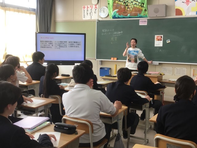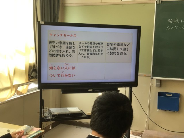 2年生の家庭科の授業の様子です。消費者被害について、具体的な例とその回避策や注意点を学びました。社会人として生きていく上で、自分の身を自分で守ることも大切ですね。
