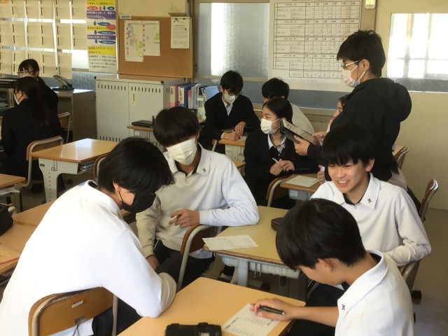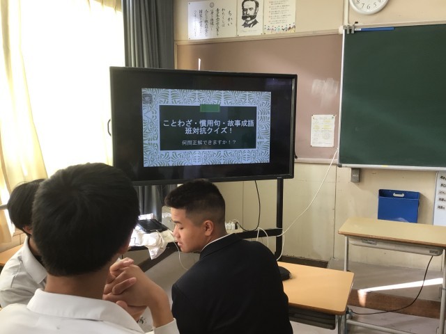 ことわざ、慣用句の問題をクイズ形式で学んでいます。ペアで話し合いながら取り組んでいます。