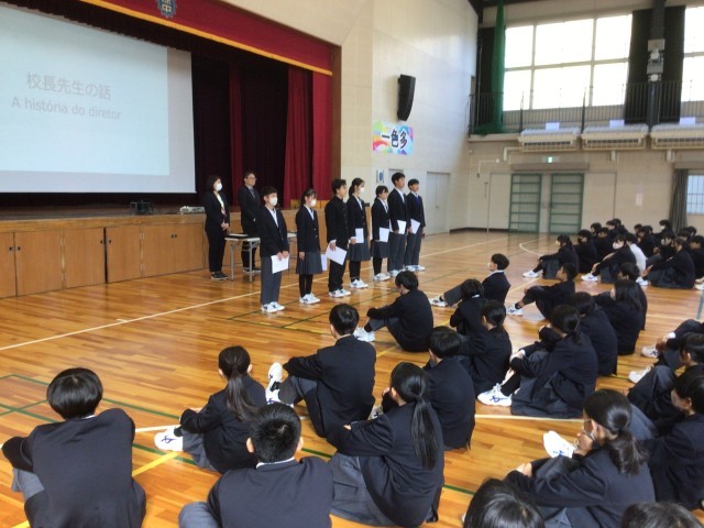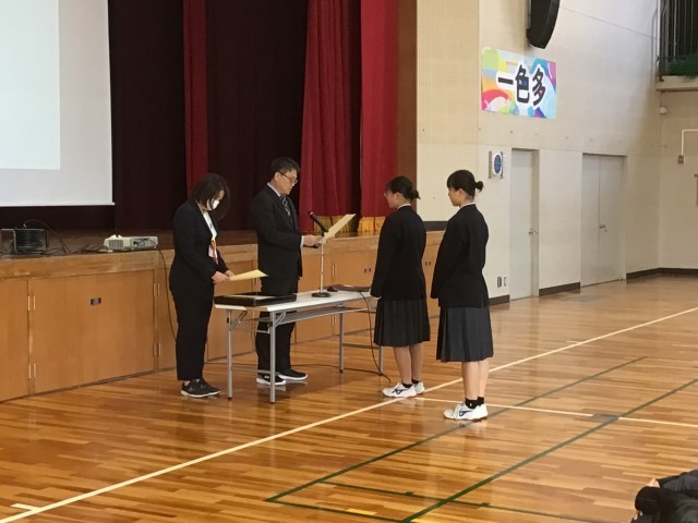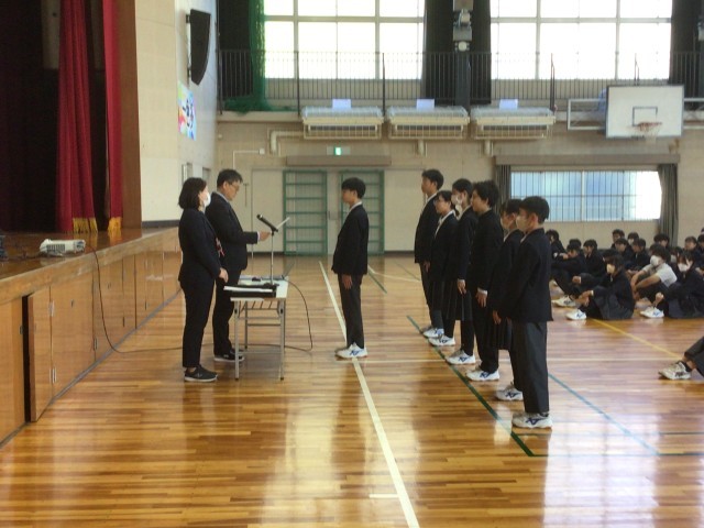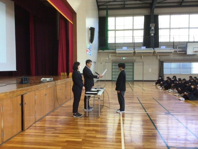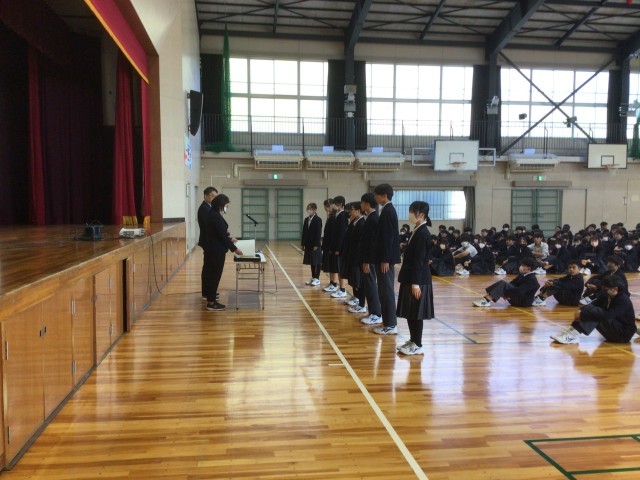 修了式の様子です。はじめに表彰が行われました。その後、生徒会の認証を行いました。生徒会執行部は返事も大きく、次期会長が来年度の抱負を話しました。学校を牽引するやる気が感じられました。
