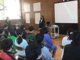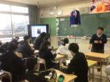 入学説明会で来校した児童たちに、1年生の生徒が挨拶をし、2年生が作った学校紹介ム...