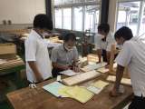 技術では本棚作りを行っています。慎重に寸法を測っています。