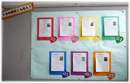 学年掲示板に担任紹介を生徒が行う掲示物があります。