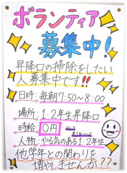 手作りのポスターを作成し、1・2年昇降口に掲示しました。