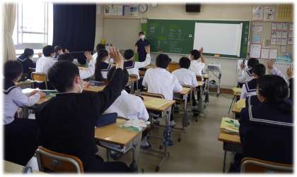 授業の冒頭で、互いに関わり合いながら、自分たちで新たな考えを創り出す力を高めようと、「お題」に対する意見交流を行っています。