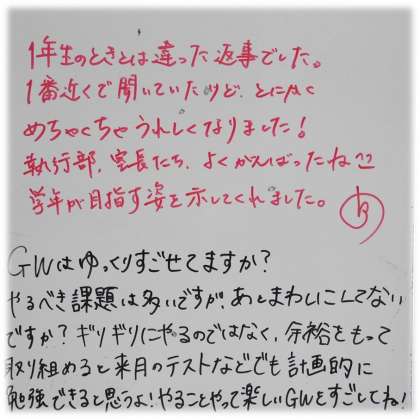 今朝、2年生のホワイトボードには、そんな生徒たちの成長を喜び、かみしめる学年主任のメッセージがありました。あったかく、うれしい気持ちになりました。