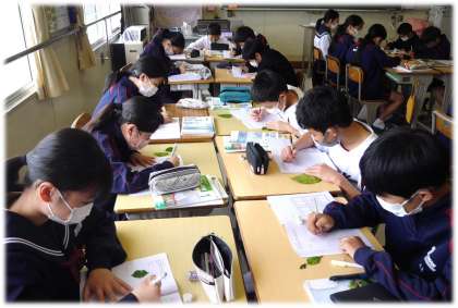 2種類の葉をスケッチしながら見比べ、それぞれの葉の特徴についての気づきを出し合っていました。葉脈の向きにも特徴がありそうでした。