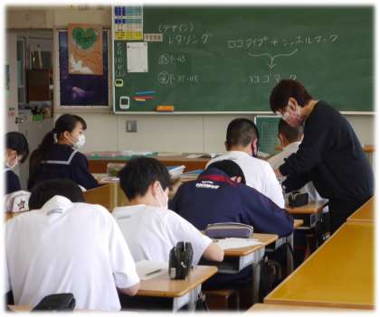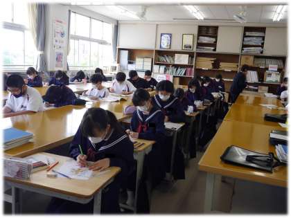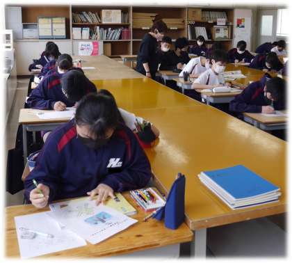 レタリングの技術を磨いています。明朝体とゴシック体の特徴をおさえて、デザインしていきます。色鉛筆で彩色をする際にも、濃淡のグラデーションをつけたり、色の組み合わせを考えたりと、それぞれに工夫しています。