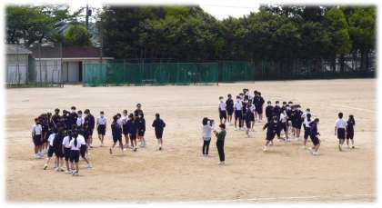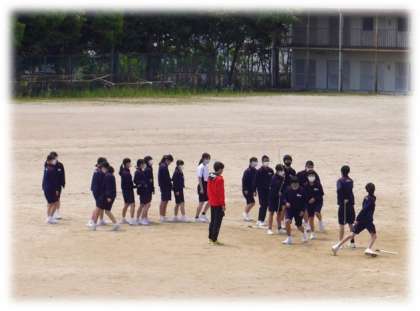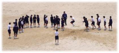 どの学年も、保健体育科の授業の中で、体育祭種目の競技練習が始まっています。元気のよいかけ声に魅かれて運動場をのぞくと、2年生、3年生それぞれに、8の字跳びの練習の真っ最中でした。