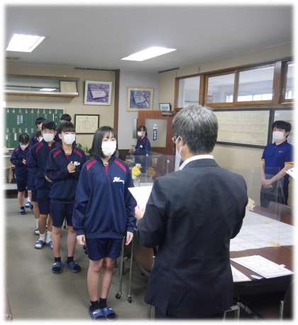 今朝は、校長室にさわやかな返事の声が響きました。2年生の4月のクリーンアップ賞・グッドマナー賞の表彰です。