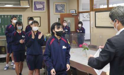 受賞にあたっての取り組みのすばらしさに加えて、そのことをしっかり受け止め、自信をもって返事をする2年生。その返事の声、表情、姿勢に、1年前とは違うたくましさ、凛々しさを感じます。認証式で仲間が立派な姿、返事で臨む姿が、このような形で、一人一人につながっていることに、2年生の絆を感じました。