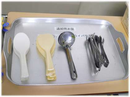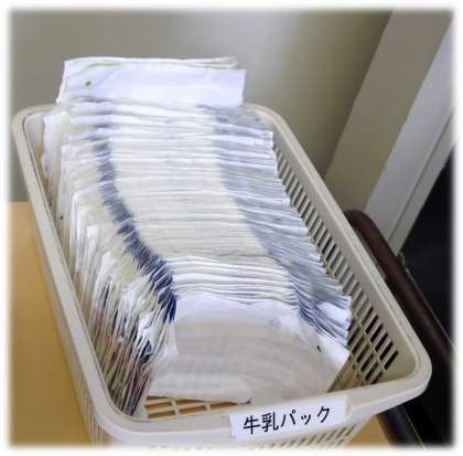 配膳室に片づけられる「お玉やしゃもじ」「牛乳パック」。写真を見てください。この美しさを!そして、極めつけは、学級から出されるごみ。小さくコンパクトにまとめられています。