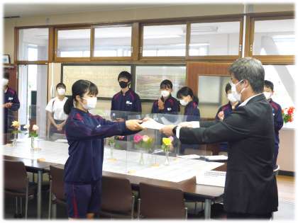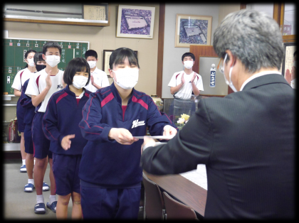 そんな投げかけ後、校長室に入室してくる姿はきりりと緊張感ある姿でした。そして、学年主任の呼名への張りのある返事はもちろんのこと、受け取る際の眼差しがまっすぐ校長を見つめます。その姿こそ、3年生らしさを感じました。