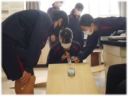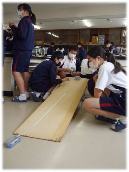 記録タイマーを活用して、運動の様子を記録し、物体の運動について考察する授業です。班ごとに協力して、実験を行い、記録用紙から気づきを共有していきます。