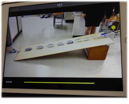 先ほど紹介した理科の授業では、生徒たちが取り組む実験を教師が学習用タブレットで撮影していました。台車の動きを記録し、画面上で合成することで、台車の軌跡を見える化します。