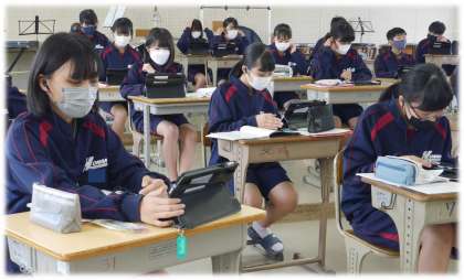 今日は、音楽科の授業で、パートごとの音程を習得するために、タブレットを活用していました。イヤホンから流れる自分の担当パートの音程に集中しています。じっと耳を傾けている姿、一緒に口ずさみ、音取りをしている姿と様々です。