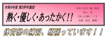 次号以降で紹介したいと思っていますが、木曜日のクリーン・グッドの表彰では、見違えるほどかっこいい姿がありました。学年練習でもきびきび動く姿がありました。そして今日、昼から学年で楽しい時間を過ごしましたが、相変わらず素直に盛り上がっていました。そんな2年生の姿を見ると、スキップしたくなるような気持ちになってきます。
