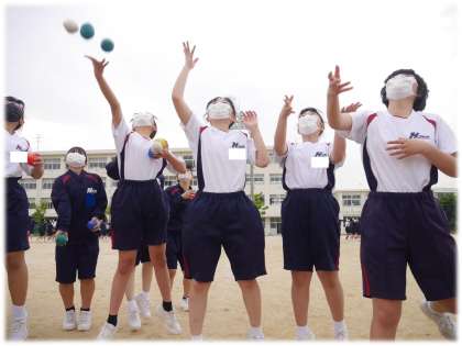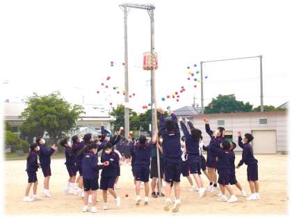 どの学級も、担任が持つかごめがけて、必死に玉を投げ入れます。必死になげる生徒たちの姿を見る担任は、いくら自分の頭上に多くの玉が降ってこようが、うれしそうです。