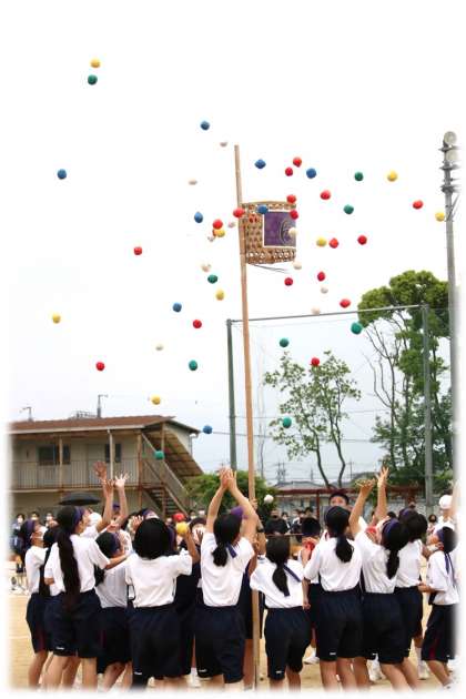 曇り空を吹き飛ばす、色とりどりの玉が空に舞い上がり、鮮やかに校庭を満たします。