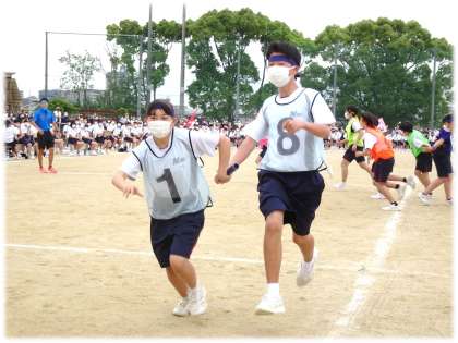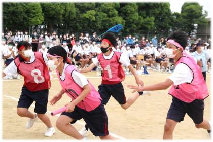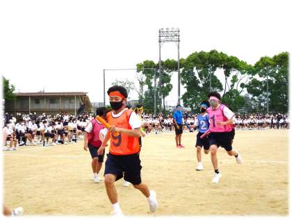 学級の、同じ組団の声援を力にして、コースを駆け抜けます。