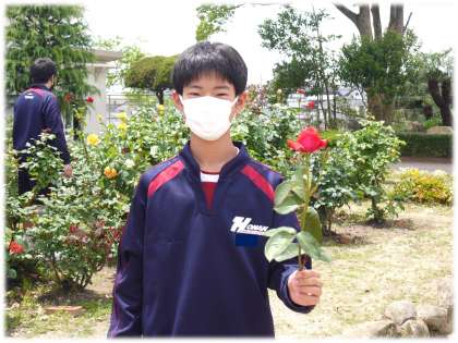 1年生時から、総合的な学習の時間で取り組んできた「インフィニティ・ローズ」昨年度、自分たちが調べた方法で薔薇園の整備を進めた2年生は、見事に咲いた薔薇をもう一度家族へ届けようと、一人1本、こだわりの薔薇を選び、摘み取っていました。