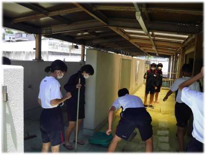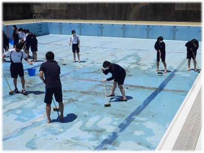 また、月末から始まる水泳の授業に向けて、プール清掃も行っていました。2年ぶりとあって、清掃も大変です。
