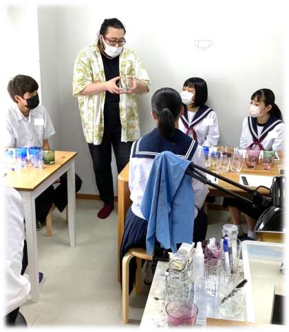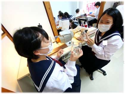 慎重に、慎重に、ガラスを専用の研ぎ器で削っていきます。