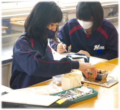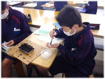 今日は、白い卵の殻の裏側に墨を塗っていました。白色の殻は、細かくすると、表と裏の見分けがつきづらくなるため、裏側をあえて黒くしているそうです。