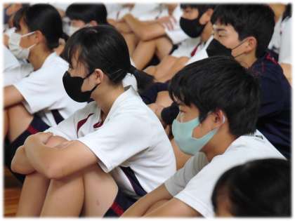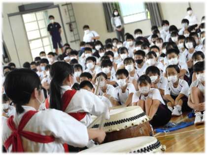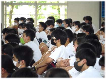 パソコン部員の日頃の取り組みを生かしたユーモアあふれる映像、ブラスバンド部員の心を音にのせて奏でるハーモニー、美術部員の「描く」という表現方法にこめた思い、家庭科部員の浴衣製作を時間をかけて行ってきたものづくりの思い、そして和太鼓部の勇壮で、空気をも揺らす迫力ある演奏。体育館で、発表生徒の熱量を肌で感じた1・2年生の眼差しもまた真剣でした。