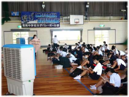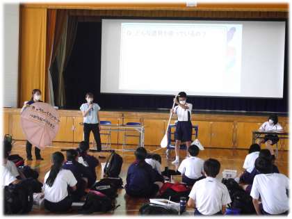 家庭用鍋とは比べようもない大きさの大鍋の模型、それに見合う大きなかき混ぜ棒等、具体的な様子を交えて説明される内容に、保健委員の生徒たちも興味津々。たくさんの人たちの「小中学生においしい給食を届けたい」という温かい思いと工夫に支えられていることを感じる時間となりました。