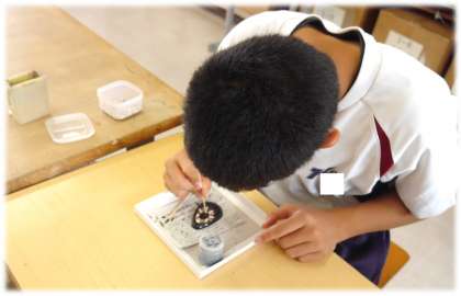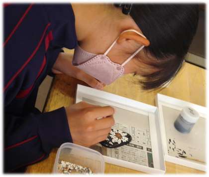 卵の殻の色(白・茶)を生かしています。集中力の必要な制作活動ですが、生徒たちの目は真剣です。黙々と自分の作品に向き合っていますね。