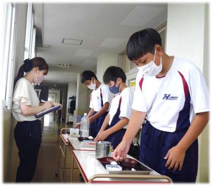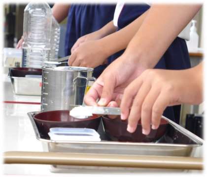 教師から指示された分量の水や食塩について、適切な計量スプーンを選択して、計量していきます。