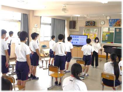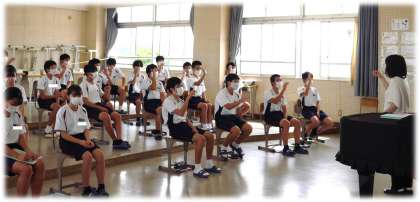 教科担任の「声を響かせるコツ」を聞き、真剣な表情で練習に取り組んでいます。