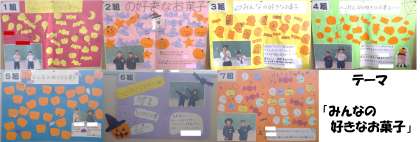 各学級の書記のみなさんが休み時間等を利用して、制作を進めていたものです。今回のテーマは、「学級のみんなが好きなお菓子」。一人一人のベスト1をレイアウトしたり、学級内でアンケートをとったものをベスト3としてまとめたりと、それぞれに工夫を凝らしています。